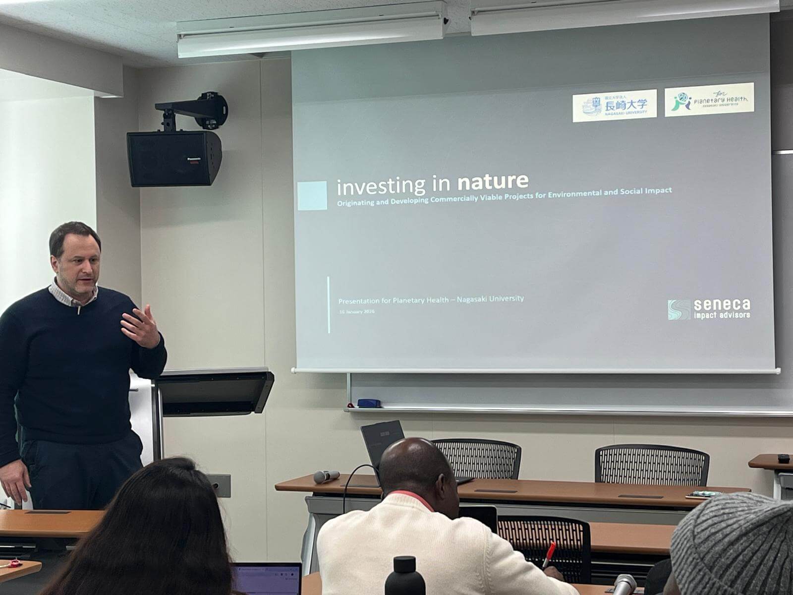 On 16 January 2026, We contributed once again to the Planetary Health doctoral programme at Nagasaki University. This marks the third consecutive year that the university has invited Seneca to participate, reflecting a sustained collaboration focused on practical implementation, financial pathways, and emerging approaches to nature and climate challenges.